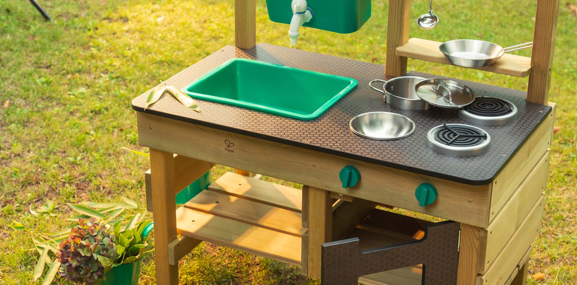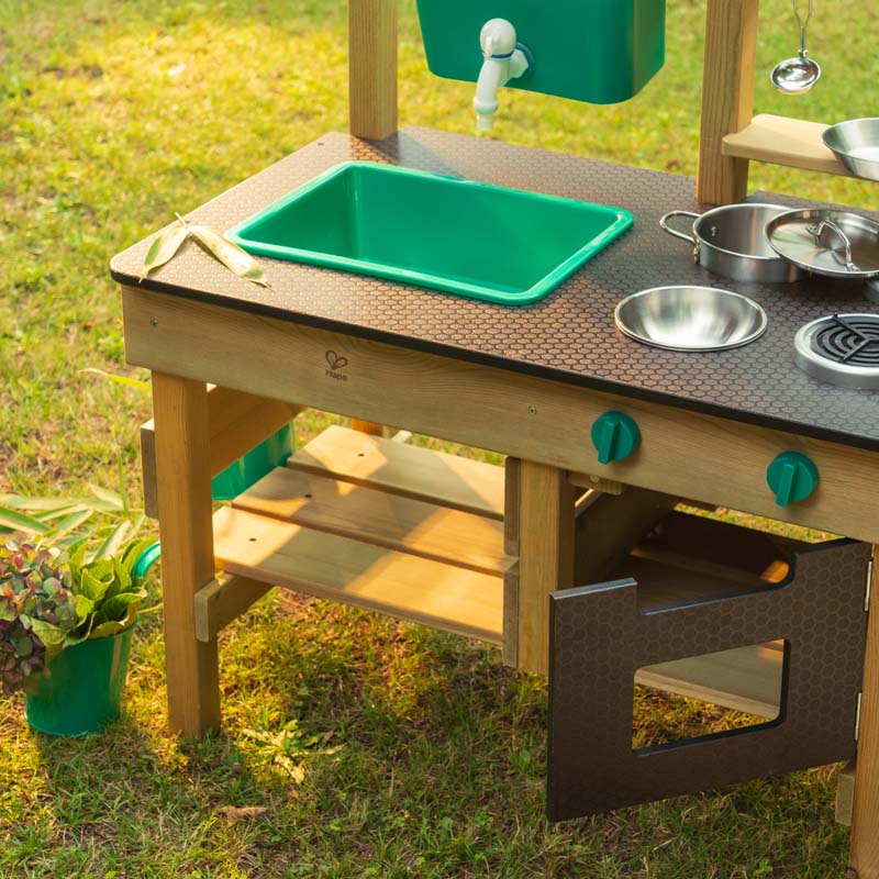 Idéale pour les beaux jours et les jeux d’eau, cette cuisine d’extérieur est entièrement équipée : réservoir d’eau, robinet, évier, cuisinière, four et accessoires fournissent l’essentiel pour concocter d’excellents petits plats ! Et si les enfants préfèrent jardiner, ils pourront cultiver leurs petites herbes aromatiques dans les pots de fleurs suspendus.