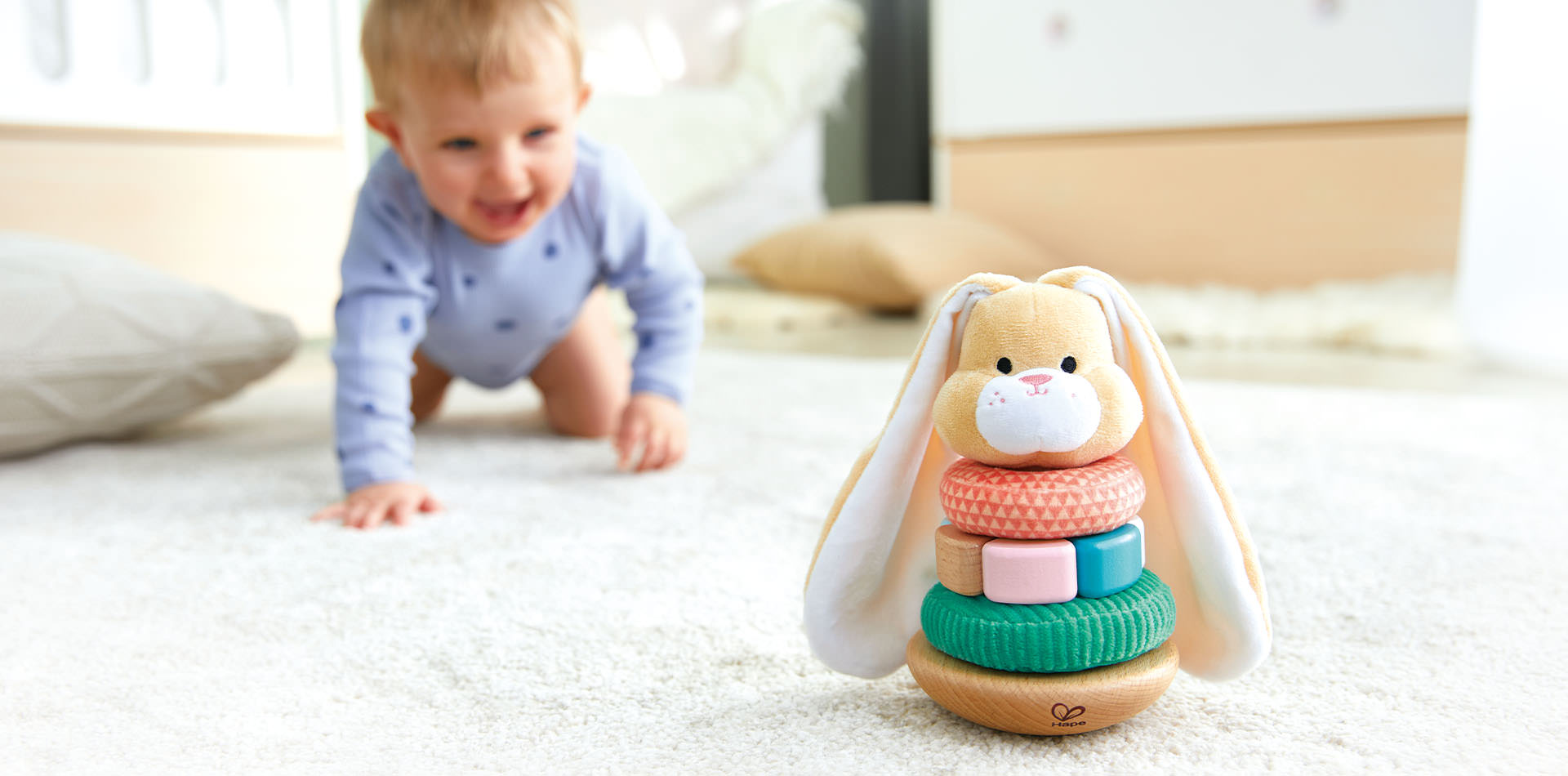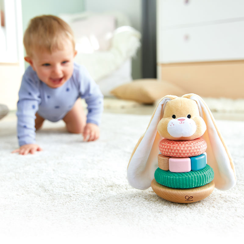 Cet adorable lapin à empiler est idéal pour les bébés avec ses 3 anneaux texturés et sa tête moelleuse.