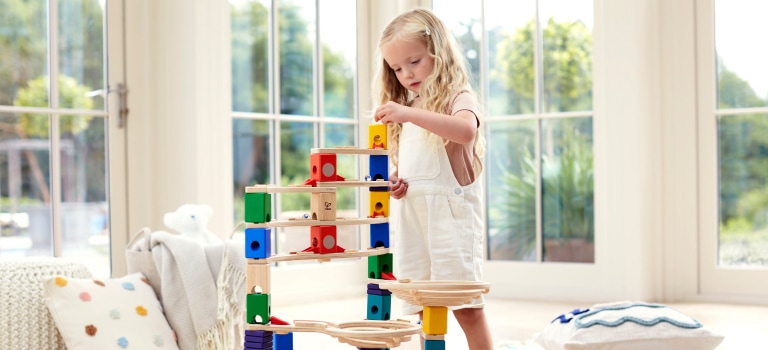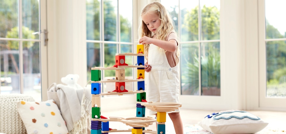 Commencez à construire vos propres circuits de billes avec ce set Quadrilla pour débutants. Déposez deux billes au sommet et observez-les faire la course jusqu'en bas par différents parcours.
