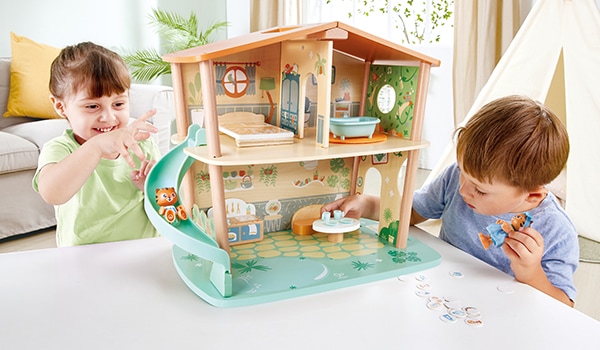 Laissez vos enfants imaginer la maison de leurs rêves. Cette maison de poupées à trois étages est prête à accueillir vos petits : c’est parti pour des heures de jeu ! Les enfants y trouveront une chambre parentale, une chambre d’enfants, une salle de bains, un salon, une salle à manger, deux balcons, un jardin et sept ensembles de meubles à utiliser comme décor pour une vie de famille créative.