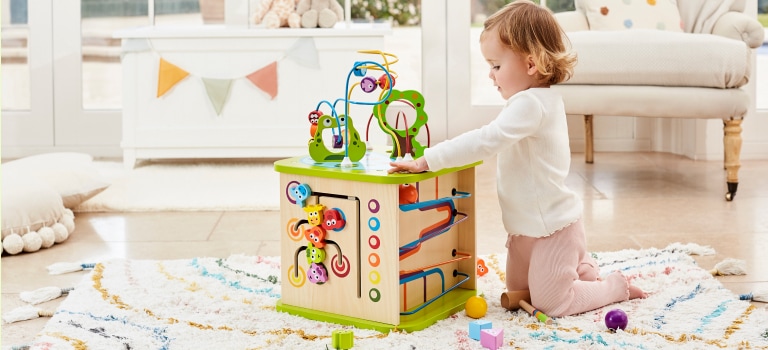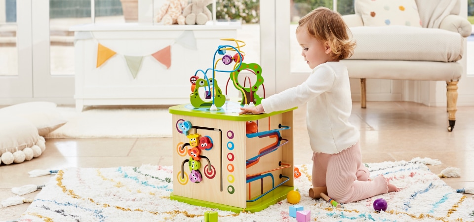Des labyrinthes, des formes, des leviers et de nombreuses créatures qui volent, qui nagent et qui croassent font de ce cube d'activités à cinq faces un jouet passionnant. En bois robuste, décoré de peintures à l'eau, il résistera à des années de jeu.