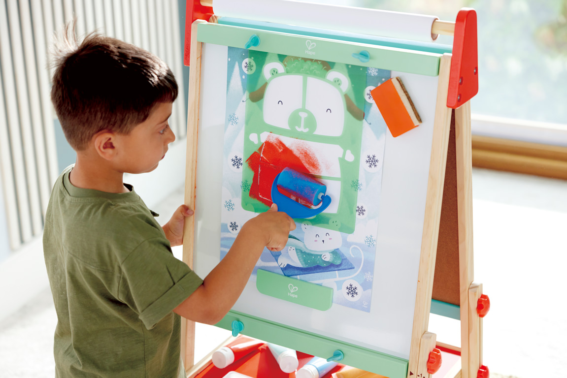 Kreative Genies kommen mit dieser tollen Staffelei voll auf ihre Kosten! Die Staffelei vereint drei Funktionen: Tafel, magnetisches Whiteboard und Papierstaffelei. Gemeinsame Kreativität macht einfach doppelt Spaß! Die Kinder können sowohl die Vorder- als auch die Rückseite der Staffelei verwenden und zusammen Malen und Gestalten. Langeweile kommt hier definitiv nicht auf! Dank einstellbarer Höhe kann die Staffelei an die Größe der Kinder angepasst werden.